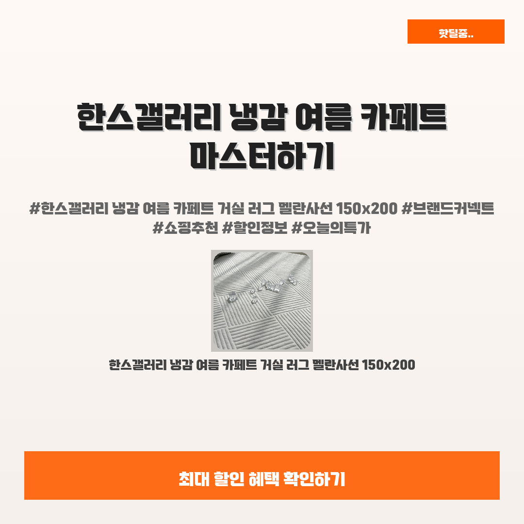 🛍️ 이 포스팅은 네이버 쇼핑 커넥트 활동의 일환으로,판매 발생 시 수수료를 제공받습니다.오늘 소개할 제품은 단연코,,바로 한스갤러리 냉감 여름 카페트 거실 러그 멜란사선 150x200입니다!여름철 무더위에 지쳐있는 여러분, 시원하고 쾌적한 생활 공간을 원하시죠?이 카페트는 여름에 최적화된 냉감 소재로, 더위를 식혀주면서 편안한 분위기를 만들어 줍니다.이제는 더운 날씨 때문에 집에서 지내는 것이 힘들지 않아요!한스갤러리의 카페트로 여러분의 거실을 시원하고 아늑하게 변모시켜 보세요.더구나 이 가격, 단돈 88,800원에 만나볼 수 있다니, 가성비 최고죠? 여름철 인테리어에 변화를 주고 싶다면, [한스갤러리 냉감 여름 카페트]를 꼭 확인해보세요!※ 이거 진짜 제가 직접 써보고 쓰는 리뷰예요 광고 아님!!한..