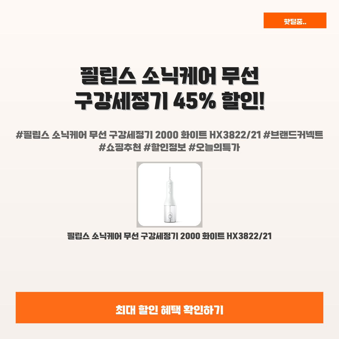 🛍️ 이 포스팅은 네이버 쇼핑 커넥트 활동의 일환으로,판매 발생 시 수수료를 제공받습니다.오늘 소개할 제품은 정말 특별해요!여러분의 구강 건강을 책임질 필립스 소닉케어 무선 구강세정기 2000 화이트 HX3822/21 입니다!요즘 마스크를 쓰는 시간이 길어지면서 구강 청결이 더욱 중요해진 거 아시죠?그냥 양치질로는 부족한 이 느낌, 그래서 저도 이 구강세정기를 처음 접했을 때 생활이 완전히 달라졌어요!이 제품을 사용한 후로는 어떤 음식도 걱정 없이 즐길 수 있게 되었고,여러분도 입안의 쾌적함을 꼭 경험해보시길 바라요!그리고 지금은 믿을 수 없는 45% 할인까지 진행 중이에요!이렇게 놀라운 가성비로 가득한 제품을 놓치는 건 절대로 후회할 일이랍니다!※ 이거 진짜 제가 직접 써보고 쓰는 리뷰예요 광고 아님..
