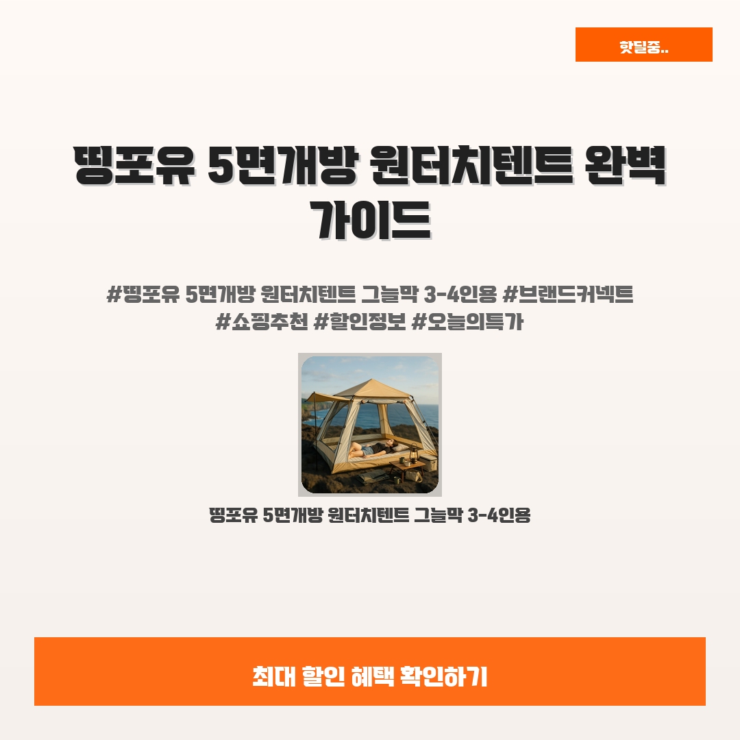 🛍️ 이 포스팅은 네이버 쇼핑 커넥트 활동의 일환으로,판매 발생 시 수수료를 제공받습니다.오늘 소개할 제품은 단언컨데,,그야말로 완벽한, 갓벽한, 놀라운 상품입니다!캠핑이나 피크닉을 준비하면서 그늘막을 고민하고 계신가요? 특히 3-4인용으로 넉넉한 공간을 원하신다면 띵포유 5면개방 원터치텐트가 정답입니다!친구들과 즐거운 시간을 보내는 데 있어 가장 중요한 건 편안한 공간이죠. 하지만 일교차나 햇빛 때문에 불편함을 느낀 경험이 많으실 거예요. 그런 당신을 위해 이 텐트가 최적의 해결책이 되어줄 거라 믿습니다.강한 햇빛으로부터 완벽하게 보호해주며, 설치와 해체가 간편한 원터치 방식이라 누구나 쉽게 사용할 수 있어요. 지금 할인된 가격 59,800원에 이 놀라운 상품을 만나보세요!※ 이거 진짜 제가 직접 써..
