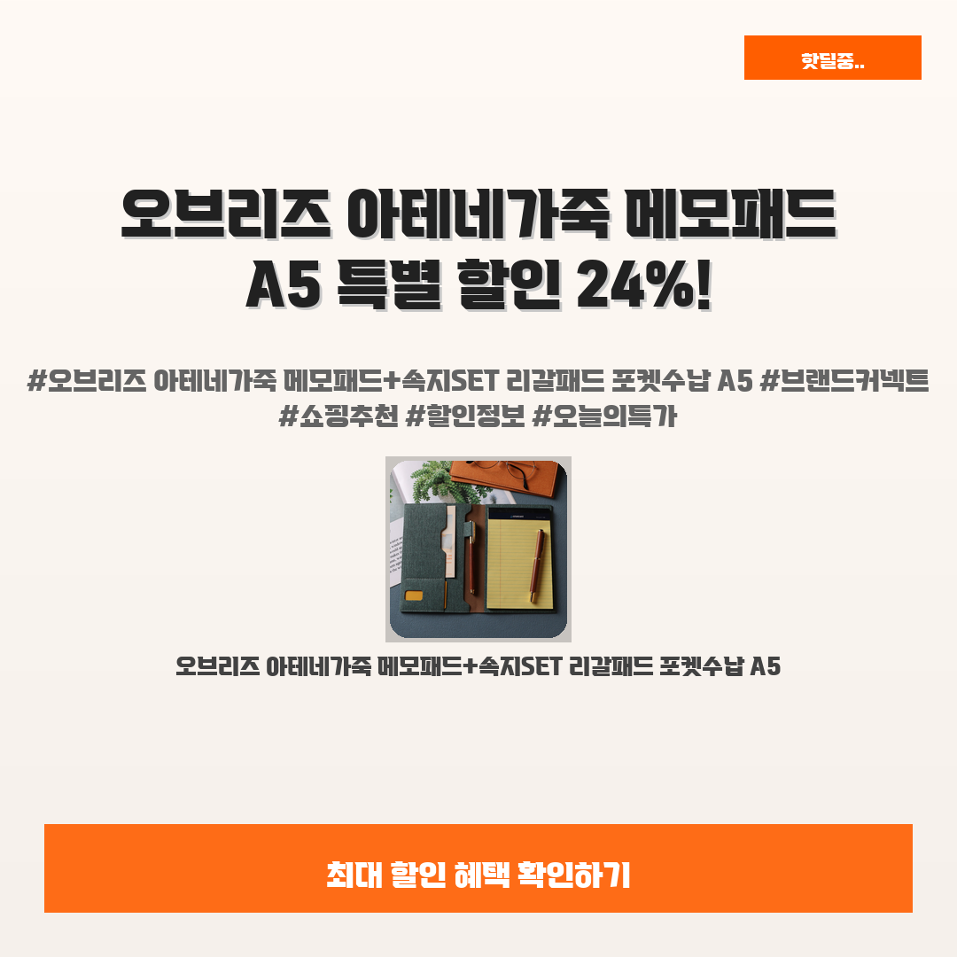 🛍️ 이 포스팅은 네이버 쇼핑 커넥트 활동의 일환으로,판매 발생 시 수수료를 제공받습니다.오늘 소개할 제품은 단언컨데,,그야말로 완벽한, 갓벽한, 감동적인 제품이라구요요즘 많은 분들이 메모패드를 찾고 계신데, 그중에서도 "오브리즈 아테네가죽 메모패드+속지SET 리갈패드 포켓수납 A5"는 정말 주목할 만한 제품이에요! 특별 할인 중이라 가격도 15,800원으로 매우 합리적이죠.기억력에 자신 없는 분들, 혹은 아이디어를 잊기 싫은 분들에게 이 메모패드는 제대로 된 해결책이 될 거예요. 가죽 재질 덕분에 고급스럽고, 포켓 수납 기능은 더욱 스마트한 사용을 도와주죠!만족스러운 상품이라고 자신 있게 추천할 수 있어요! 가성비까지 갖춘 이 메모패드와 함께라면 언제든지 아이디어를 기록하고 소중한 순간들을 저장할 수..