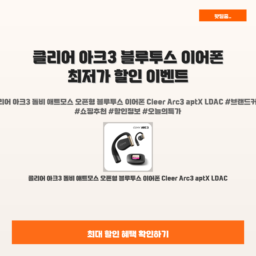 🛍️ 이 포스팅은 네이버 쇼핑 커넥트 활동의 일환으로,판매 발생 시 수수료를 제공받습니다.오늘 소개할 제품은 단언컨데,,그야말로 완벽한, 갓벽한, 감동적인 제품이라구요최근 블루투스 이어폰을 찾고 계신가요? 클리어 아크3 돌비 애트모스 오픈형 블루투스 이어폰 Cleer Arc3 aptX LDAC가 바로 당신의 기대를 초월할 제품이에요!정가 289,000원에서 10% 할인된 259,000원에 만나볼 수 있는 기회, 놓치지 마세요!여러분도 뛰어난 음질과 편안한 착용감을 경험하며 행복감을 느끼고 싶죠? 최신 기술이 적용된 클리어 아크3는 그 문제를 한 번에 해결해줄 솔루션입니다🤩사운드 품질은 물론, 오픈형 디자인으로 편안함까지 갖춘 이 이어폰은 상상 이상의 만족감을 선사할 거예요.고객 후기가 극찬하는 이유를..