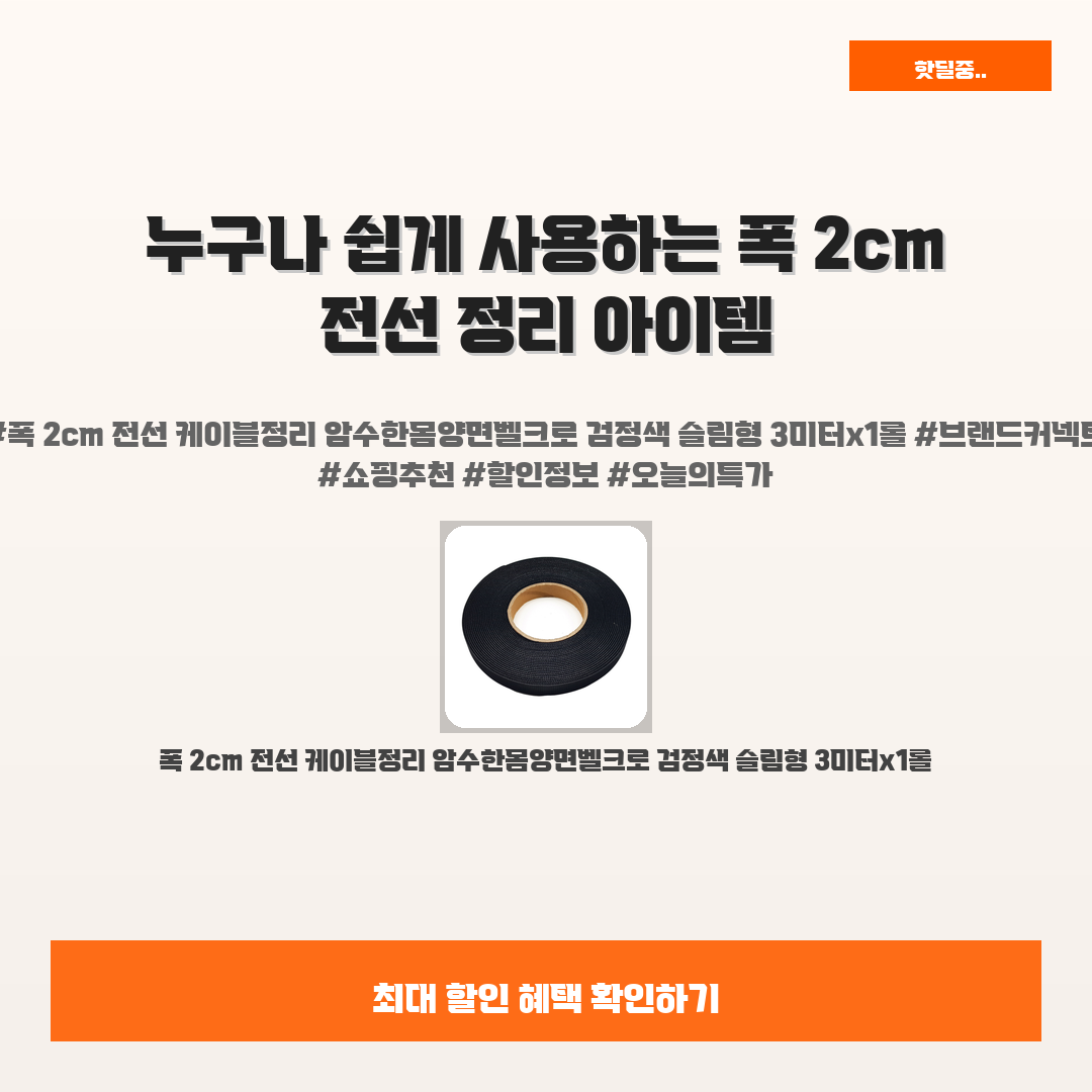 🛍️ 이 포스팅은 네이버 쇼핑 커넥트 활동의 일환으로,판매 발생 시 수수료를 제공받습니다.오늘 소개할 제품은 단언컨데,,바로 폭 2cm 전선 케이블정리 암수한몸양면벨크로 검정색 슬림형 3미터x1롤입니다!전선이 엉켜서 답답하시죠? 정리하기 어려운 전선 문제, 이제는 간단하게 해결할 수 있어요. 이 제품은 누구나 쉽게 사용할 수 있어, 집이나 사무실에서 유용하게 쓰실 수 있습니다."이젠 전선 정리 때문에 스트레스 받지 않을 거예요!" 한 번 사용해보면 이 만족감을 느끼실 수 있을 거예요. 많은 분들이 극찬하는 이 제품, 믿고 사용해 보시길 추천합니다!게다가 최근 할인까지 적용되어 6,900원으로 구입할 수 있다는 사실! 실제로 저도 사용해보니 가성비가 뛰어나서 주변에 추천하고 다니고 있어요.※ 이거 진짜 ..