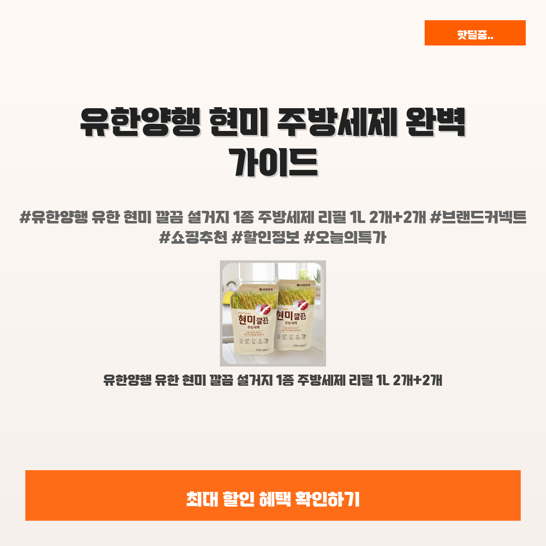 🛍️ 이 포스팅은 네이버 쇼핑 커넥트 활동의 일환으로,판매 발생 시 수수료를 제공받습니다.오늘 소개할 제품은 단연코,,바로 유한양행 유한 현미 깔끔 설거지 1종 주방세제 리필 1L 2개+2개입니다!설거지가 귀찮고 번거롭게 느껴지는 순간, 여러분은 어떤 주방세제를 선택하시나요?바로 이 주방세제는 깨끗함과 환경을 생각하는 완벽한 솔루션이 되어줄 거예요!이 주방세제를 쓰면 기름때와 찌꺼기를 깔끔하게 제거해주면서도, 세탁 후 남는 잔여물이 없다는 걸 느끼실 거예요.여러분과 가족의 소중한 식탁을 안전하게 지켜줄 뿐 아니라,29% 할인가로 만날 수 있으니, 고민할 필요 없으시죠? 정말 최고의 선택이 될 거예요!이제는 매일의 설거지 시간이 즐거워질 거라 믿어요!사용하면서 느낄 만족감은 어디에도 뒤지지 않을 테니까요..