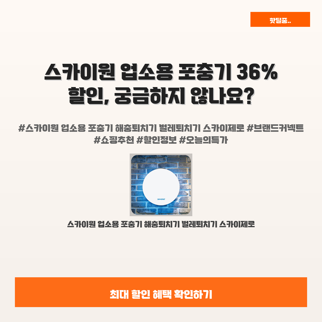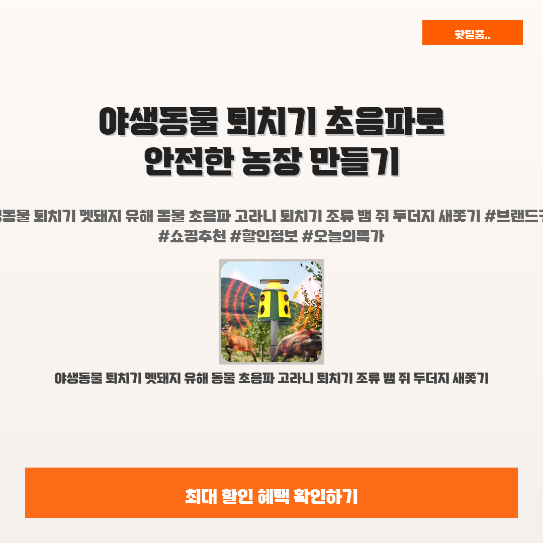 🛍️ 이 포스팅은 네이버 쇼핑 커넥트 활동의 일환으로,판매 발생 시 수수료를 제공받습니다.여러분의 농장을 안전하게!바로 야생동물 퇴치기를 소개합니다.요즘 농작물과 재산을 지키기 위해 힘들어하시는 분들 많으시죠?멧돼지나 고라니 같은 유해 동물로 인해 피해를 보셨다면, 이제 더 이상 걱정하지 마세요!우리 제품, [야생동물 퇴치기]는 초음파를 활용해 안전하고 효과적으로 농장을 보호합니다. 이 기기로 조류, 뱀, 쥐, 두더지 등 다양한 해로운 동물들을 쫓아낼 수 있어요!심지어 지금은 할인된 가격으로 만나볼 수 있으니, 정말 기회를 놓치지 마세요! 세상에 이보다 더 효율적인 방법은 없답니다. 농장 안전을 위한 필수 아이템, 확인해보세요!※ 이거 진짜 제가 직접 써보고 쓰는 리뷰예요 광고 아님!!야생동물 퇴치기 ..
