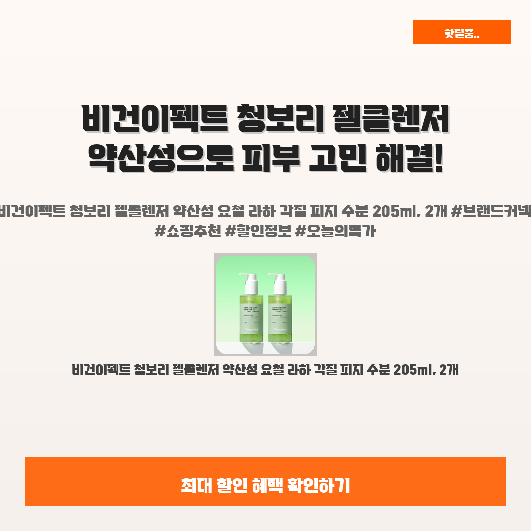 🛍️ 이 포스팅은 네이버 쇼핑 커넥트 활동의 일환으로,판매 발생 시 수수료를 제공받습니다.여러분! 오늘 소개할 제품은 바로,,비건이펙트 청보리 젤클렌저 약산성으로 피부 고민 해결! 과연 어떤 제품일까요?피부에 트러블이 자주 생기거나 각질, 피지가 신경 쓰이는 분들, 저도 그랬었어요. 약산성의 청보리 젤클렌저는 그런 고민을 덜어줄 수 있는 제품입니다.이 제품은 205ml 대용량으로 두 개 세트, 사용하면서 느끼는 수분감과 상쾌함이 정말 뛰어나요. 피부의 요철도 잡아주고 라하 성분로 각질도 관리해준답니다.특히, 21% 할인된 가격에 만날 수 있으니 가성비까지 고려한 현명한 선택이 될 것 같아요! 비건이펙트 청보리 젤클렌저, 여러분도 꼭 경험해 보세요!비건이펙트 청보리 젤클렌저 약산성 요철 라하 각질 피지 ..