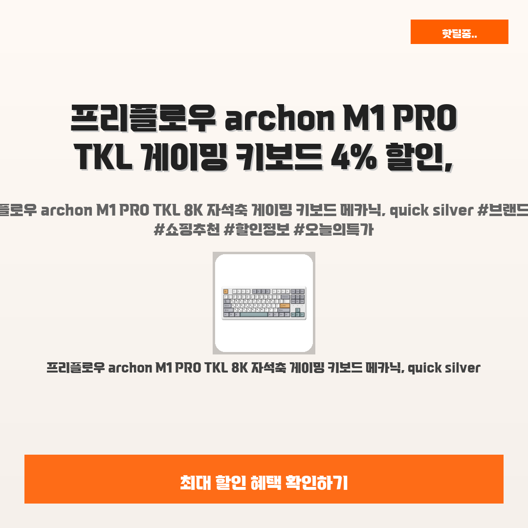 🛍️ 이 포스팅은 네이버 쇼핑 커넥트 활동의 일환으로,판매 발생 시 수수료를 제공받습니다.오늘 소개할 제품은 단언컨데,,그야말로 완벽한, 갓벽한, 감동적인 선택, 바로 프리플로우 archon M1 PRO TKL 8K 자석축 게이밍 키보드 메카닉, quick silver입니다!최근에 게임을 할 때마다 느끼는 건데, 고급스러운 타건감과 반응속도가 부족해 답답하셨던 분들 많으시죠?그래서 저도 찾다가 발견한 것이 바로 "프리플로우 archon M1 PRO TKL"이었어요.진짜 이 제품은 타건감을 느껴보자마자 "이거다!" 싶었어요!여러분도 이 강력한 성능을 직접 체험해보셨으면 좋겠어요. 이미 많은 분들이 긍정적인 피드백을 보내고 있거든요.특히 요즘은 4% 할인까지 적용되니, 가성비로는 더할 나위 없답니다!완벽한..